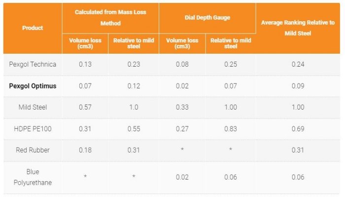 Pexgol Optimus is a new and superior pipe with high resistance to abrasion even exceeding Pexgol Technica capabilities. Unbeatable abrasion resistance versus other pipe materials such as HDPE and steel with improved wear resistance.