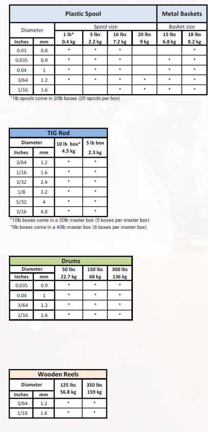 ER4043 is a 5% Silicon aluminum filler metal that is one of the most widely used aluminum welding alloys for fabrication and general repair in the aluminum welding industry. The smooth running ER4043 is often preferred because of its flowing characteristics and its reduced crack sensitivity over other aluminum welding wires. ER4043 is available in spools and cut lengths for both MIG and TIG welding and is recommended for base metals 3003, 3004,5052, 6061, 6063 and casting alloys 43, 355, 356 and 214. ER4043 has a melting range of 1065-1170 Fand a density of .097 lbs/ci. Its post anodizing color is gray.