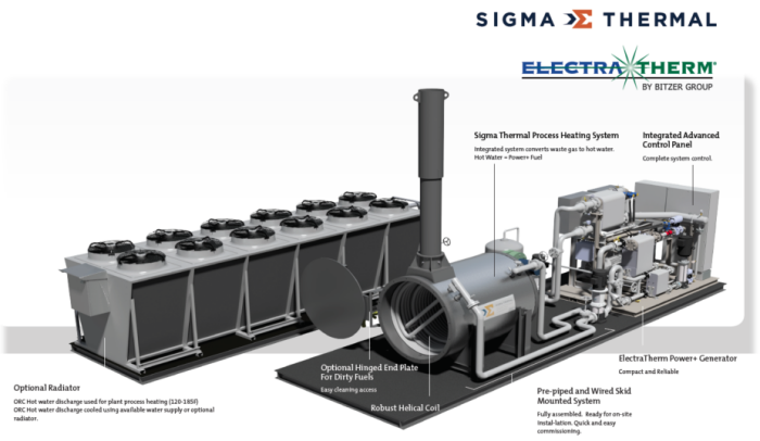 To convert waste heat energy into usable electricity, Sigma Thermal has partnered with ElectraTherm, to offer an integrated package containing an Organic Rankine Cycle (ORC) generator, helical coil heater, condenser, and evaporator. The waste fuel is captured by an existing industrial process and used for power conversion. When the NextGen Emissions Reduction System + Power is utilized, gas and oil production, wastewater treatment plants, landfills, farms, and other waste fuel-producing facilities can greatly reduce emissions while minimizing or eliminating flaring.