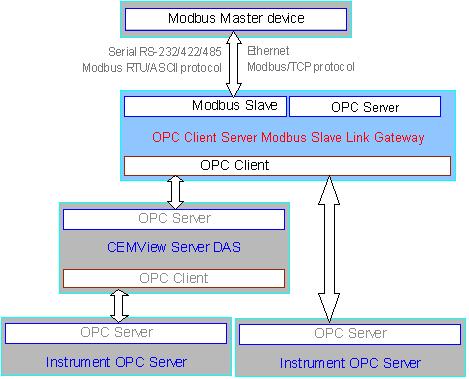This product allows the user to connect any modern OPC based application, such as our CEMView products or any instrument with our OPC Server products, to a legacy system such as a DCS or PLC with Modbus master serial or Modbus/TCP capability.