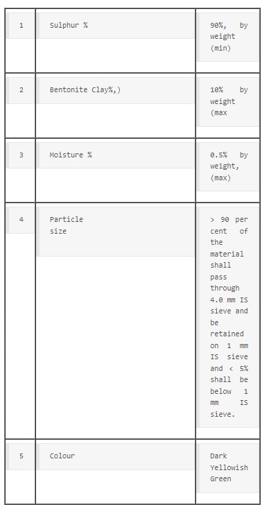 Bentonite Sulphur is straight Sulphatic fertilizer containing Sulphur and Bentonite clay. The Sulphur present is 90% in these fertilizers and is the highest among other category of Sulphated fertilizers. This makes Bentonite Sulphur more effective in terms of supplying Sulphur to Crops. In fertilizers, besides N, P, K nutrients, Sulphur is the 4th major plant nutrient. Sulphur is an essential component in the synthesis of amino acids required to manufacture Proteins. Sulphur is also required for production of chlorophyll and utilization of phosphorus and other essential nutrients.