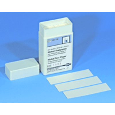 This test paper can be used for the determination of nickel in solutions as well as in materials containing nickel (non-destructive testing of alloys). In the presence of nickel ions(Ni2+) the white test paper turns red. Interferences caused by iron, cobalt or copper can be circumvented as described in the instructions for use supplied with the paper. Limit of sensitivity: 10 mg/l Ni2+ Note: For the determination of nickel in alloys, apply 1 drop nitric acid 3 % to the degreased surface. After about 1 minute absorb the liquid with the test paper. The presence of nickel is indicated by an intense red color. The paper can also be used to test for nickel in consumer goods (zip fasteners, bracelets, buttons etc.).Limit of sensitivity: 0.5 % Ni
