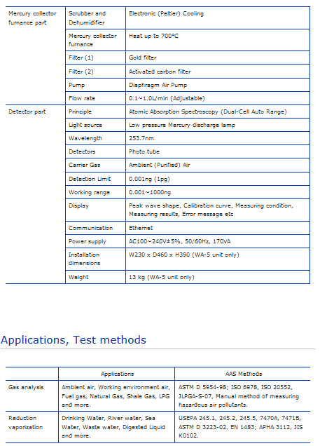 The WA-5A is atmospheric mercury analyzer that can be connected to the automatic sample changer (TC-WA) dedicated to mercury collector tubes. Based on the double-amalgamation method of the previous model, its design was totally renewed. The WA-5A is equipped with not only high-performance options which enable measurement of environment air and various gases (LPG/LNG, flue gas, etc.) in various matrices, but also a newly developed optical system as standard so that it can prevent loss of precious samples, thus, you can measure from low to high concentrations while the equipment automatically sets the measurement range.