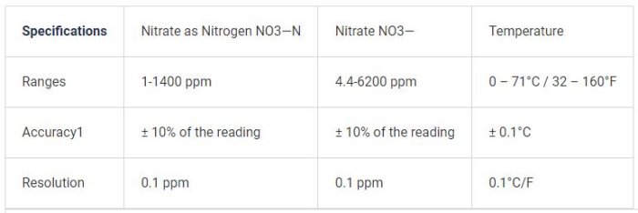 - NO3: Display alternates between Nitrate (NO3-), and Temperature