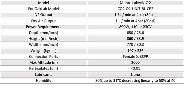 The Munro LabMix-C provides clean dry air and Nitrogen gas generation using a single integrated compressor in the one device. A dryer and 0.01µm filter set is used to provide clean dry air, and a Pressure Swing Adsorption (PSA) based system produces Nitrogen.