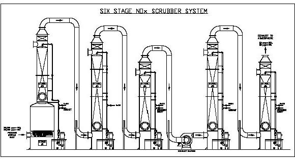AAT, Inc. Orion series NOx Air Scrubber Systems may incorporate as many as six scrubbing steps in-series, depending on NOx constituents and concentrations. Unlike other acid gases, NOx is not effectively scrubbed using caustic water alone. Strong reducing and/or oxidizing agents applied sequentially are also required. Furthermore, extended tower packing bed heights are required. Since the best reducing agent for NO2 air scrubber is sodium hydrosulfide (NaHS), a final odor control air scrubber to prevent hydrogen sulfide (H2S) slip may also be desirable.