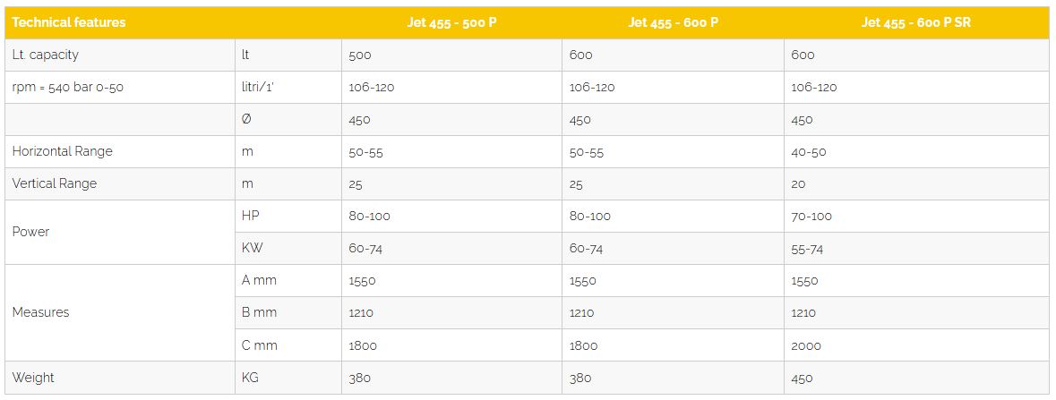 The Nobili JET mist-blowers are tractor mounted machines, fitted to the three-point linkage of the tractor lift. Ideal for treatments on grassy cultivations, high-trunk plants and in greenhouses. Manufactured with reinforced chassis and more efficient double suction turbine, the JET mist-blo-wers - with reduced dimensions – assure a strong and measured spraying whose inclination can be hydraulically adjustable in order to suit – with extreme practice – to different cultivations. The JET range is available with polyethylene tank, hand washing and circuit washing tanks in com-pliance with the European regulations. The JET range can be equipped with several fittings.JET SR version has a spraying cannon with output rotation of 110 ° vertically and 210 ° horizontally, both hydraulically adjustable.