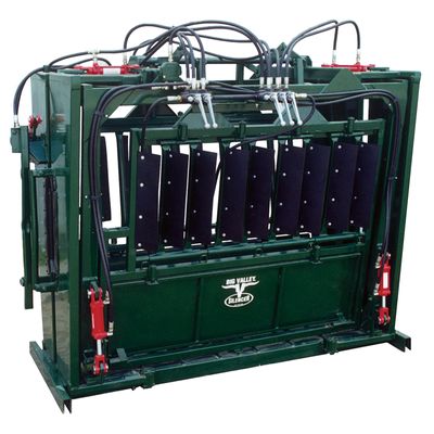 The most innovative and technologically advanced chute in the cattle industry. A patented noise reduction system of 130 contact points sheathed in oil based polyethylene to significantly reduce the noise level. Full-opening head and tail door The headgate is wrapped in rubber to prevent shoulder damage to the animal Hydraulic head restraint (becomes half of the neck bars when used that way) Rubber louvers prevent animals from seeing humans to the side of chute Dual additional neck access for precision vaccination Choice of power units For animals form 350 lbs. on up. Premium powder coat paint - Green Other models and options, including side exits are available. Call 800-447-2751 for quotes Silencer Extended model chutes are designed with a rear door for the operator to step in behind the animal for artificial insemination, semen checking, preg checking, embryo transfer, etc.