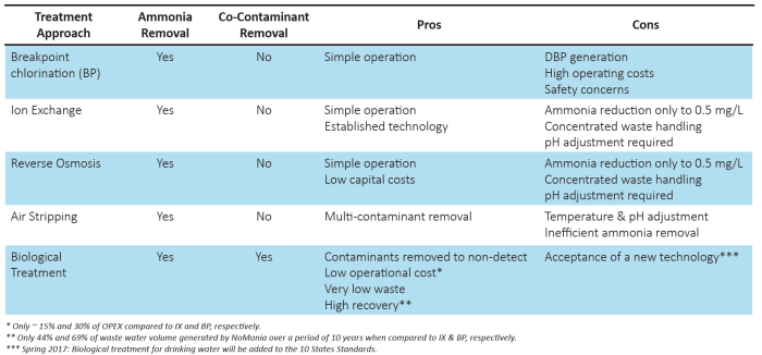 Legacy ammonia treatment approaches such as ion exchange, reverse osmosis, breakpoint chlorination and air stripping often struggle to meet the recommended MCL guideline of 0.2 mg/L. These processes require chemicals and extensive operator attention and are not environmentally sound due to the generation of concentrated wastewater.