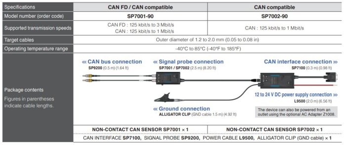 Complete measurement assurance by capturing the entire signal: Brings accuracy to automotive development and evaluation testing by preventing erroneous judgments caused by faulty detection. Also captures low-frequency events with a high degree of reliability. Avoid damage to the cable; No impact to CAN bus characteristics: The SP7001/SP7002 uses a no-metal-contact detection method that requires no contact with CAN bus electric circuitry. The technology allows evaluation testing to be carried out on public roads since test vehicles do not need to be modified.