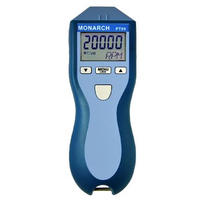 Pocket Tach 99 is a digital, battery-powered portable non-contact optical tachometer (red LED), which operates up to 36 inches from a reflective tape target using an LED light source. The ergonomic design allows safe, direct line-of-sight viewing of both the rotating target and the display at the same time while providing a non-slip rubber surface for single-hand operation. Pocket Tach Tach99 is the value leader of the world-class Pocket Tach Series from Monarch.