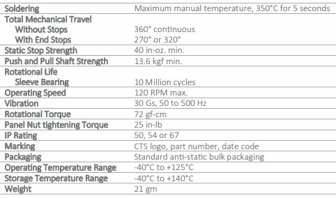 Compact 22 mm size; Extended rotational life (10 Million cycles); Wide temperature range (-40C to +125C); Precision linearity (±0.5% and ±0.25% options); Dust & water protection (IPSO, 54 and 67 options).