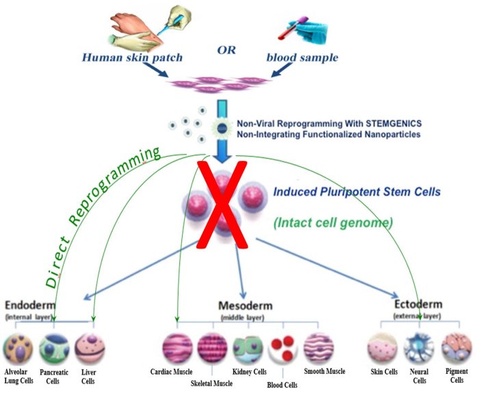 Direct cell reprogramming using hepatogenic, cardiogenic, neurogenic or other cell-type specific multi-functionalized nanoparticles is an attractive and preferred alternative to pluripotent stem cells that are known to trigger tumorigenesis.