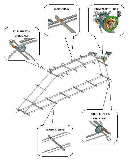 Each part of this sludge scraper will be easily  compatible to each axis diameter and chain type such "pintle" and loop " chain.   The important parts of product are designed to  be  replaceable and compatible to different products.