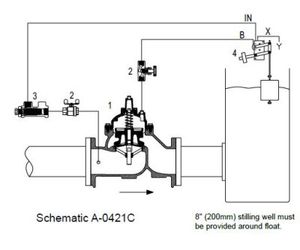 The 106-F-Type 5 non-modulating float valve is based on the 106-PG main valve. It is ideal for allowing normal forward flow to fill water tanks to a desired high level and where the pilot and valve of the storage tanks are easily accessible. The valve functions as a two-position valve, either open or closed. The valve remains closed when the tank level drops, until the float reaches the pre-determined adjustable minimum tank level. The F-Type-5 valve opens to refill the tank and closes tightly when high water level is achieved.