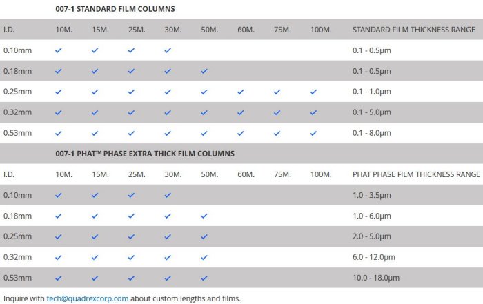 In addition to the standard range of column configurations offered with the 007-1 phase type, our unique coating technology allows us to extend the functional range of columns coated with the 007-1 phase by the application of very thick films. For example, films up to 3.5 microns on 0.10mm I.D. fused silica and 18.0 microns on 0.53mm I.D. fused silica are now possible. These PHAT Phase™ thick film columns are ideal for low molecular weight analyses previously performed on packed columns.