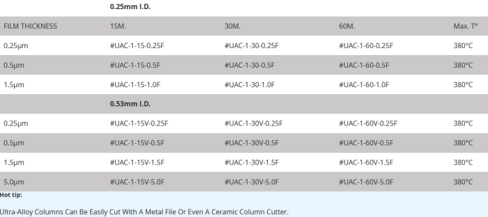 UAC-1, Dimethylpolysiloxane columns are available in the lengths and films noted below.