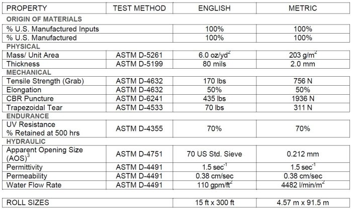 GEOTEX 651 is a polypropylene, staple fiber, needlepunched nonwoven geotextile produced by Propex, and will meet the following Minimum Average Roll Values (MARV) when tested in accordance with the methods listed below. The fibers are needled to form a stable network that retains dimensional stability relative to each other. The geotextile is resistant to ultraviolet degradation and to biological and chemical environments normally found in soils. GEOTEX 651 conforms to the property values listed below1. Propex performs internal Manufacturing Quality Control (MQC) tests that have been accredited by the Geosynthetic Accreditation Institute – Laboratory Accreditation Program (GAI-LAP).