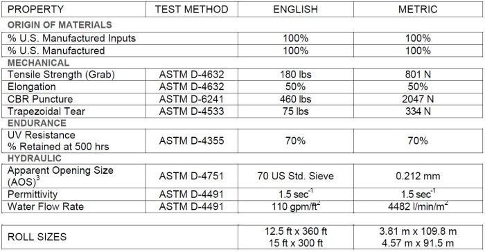 GEOTEX 701 is a polypropylene, staple fiber, needlepunched nonwoven geotextile produced by Propex, and will meet the following Minimum Average Roll Values (MARV) when tested in accordance with the methods listed below. The fibers are needled to form a stable network that retains dimensional stability relative to each other. The geotextile is resistant to ultraviolet degradation and to biological and chemical environments normally found in soils. GEOTEX 701 conforms to the property values listed below1. Propex performs internal Manufacturing Quality Control (MQC) tests that have been accredited by the Geosynthetic Accreditation Institute – Laboratory Accreditation Program (GAI-LAP). This product is NTPEP approved for AASHTO standards.