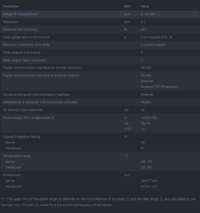 The monitoring system of rotational speed of the turbine with built-in hour meter. The composition of the tachometer system includes a tachometer unit NCB 0412, block remote indication NCB 0052 (panel mounting) / 0051 (installation on the unit) and inductive sensor IF5646 ("IFM" Germany). To make settings, and view the archived data used the software package NORMA-RS SW 1.0.