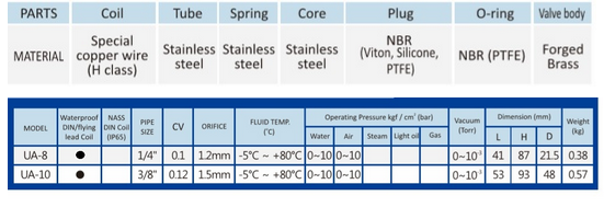 UA series is direct-acting, conductive, and normally closed (NC) 3/2 way solenoid valve. Availability of fluid type:water, air, vacuum