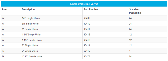 Manufactured from polypropylene. Teflon seats. EPDM O-rings (viton kits available). Pressure rated at 125 PSI @ 70°F. All valves tested by air pressure under water.
