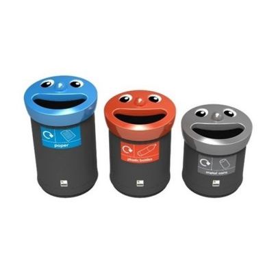 Novelty Recycling bins designed to appeal to the younger environmentalist! The New Novelty Smiley Face Recycling Bins are ideal for use in schools and nurseries. Smaller size & funny faces encourage children to feed the recycling bins with recyclable waste. Robust yet easy to handle. WRAP colour compliant, interchangeable recycling lids. Clear visual labels, colour coordinated to lids. Wipe clean surface. Strong and durable Polyethylene material. Black base units made from 100% recycled material. Stackable lids & bodies for easy storage when necessary.