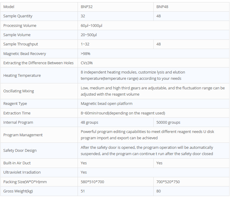 BNP32/BNP48 system is a fully-automated clinical nucleic acid extraction system that brings you walk-away automation, designed to minimize user intervention and extraction-to-extraction variability. In addition to providing quality purified eluates, the BNP32/BNP48 system offers onboard primary-sample handling and mixed-batch sampling for up to 32 or 48 samples per run.