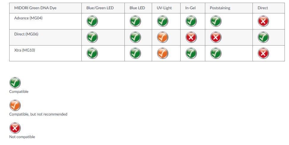 MIDORI Green Advance is a non-carcinogenic dye. Optimised for a brighter signal when excited by UV-light or Blue/Green light. It has the advantages, such as being non-carcinogenic and having an excellent signal-to-noise ratio.