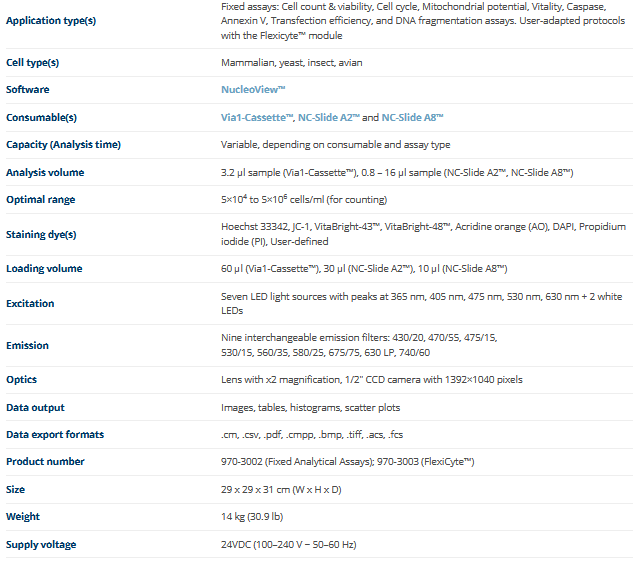 The NucleoCounter NC-3000™ advanced image cytometer utilizes fluorescence imaging to characterize cell properties. The instrument performs high-speed plug-and-play analytical assays of mammalian, yeast and insect cells. Pre-defined assays include a unique 5-minute cell cycle assay, a selection of apoptosis assays and the standard cell count and viability assay.
