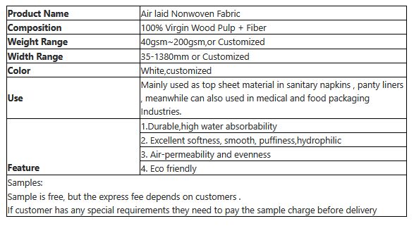 Airlaid Nonwoven Fabric also called Airlaid paper,a new type of hygienic material, which is mainly made of wood pulp and fiber.It has a strong capability of absorbing wet, especially when mixed with a definite proportion of SAP.