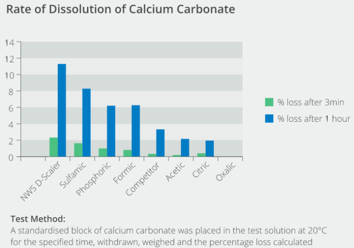NWS D-Scaler will dissolve approximately 300g of calcium carbonate for every litre of concentrate. When diluted with water, NWS D-Scaler will still dissolve the same amount of calcium carbonate for each litre of concentrate but at a slower rate.