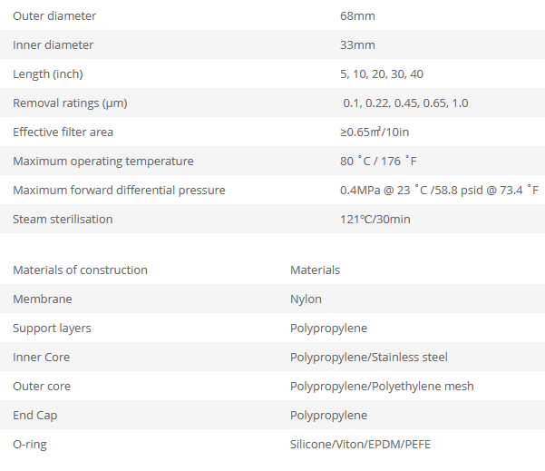Nylon Membrane Filter Cartridges are disinfecting grade cartridges that feature a nylon media. This material is well-suited for the filtration of solvents due to its broad affinity and low extractables. Additionally, due to the particles present in water and other liquids having a net negative charge, they can be effectively captured by the positively charged nylon membrane. The filter cartridges are equipped with a heavy duty molded cage, ensuring they can withstand high pressure drops. Furthermore, they are characterized by a hydrophilic Nylon membrane that provides high throughputs, low extractables, and good mechanical strength; they are regularly used for sterile filtration in Active Pharmaceutical Ingredients production.