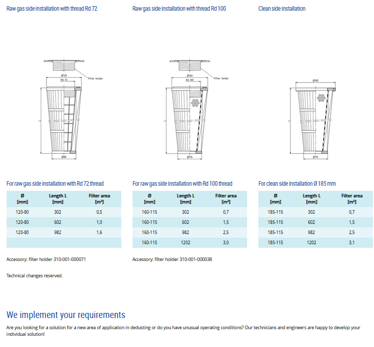 Filter Cartridges Ø 120, 160, 185 mm Conical: Compact dust collectors. Low upflow velocity in the system. Small interior space of the filter cartridge.