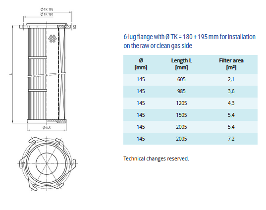 Ø 145 mm Filter Cartridge with 6 Lug Flange: For dusts that are difficult to clean. Universally applicable. Suitable for high dust concentrations.
