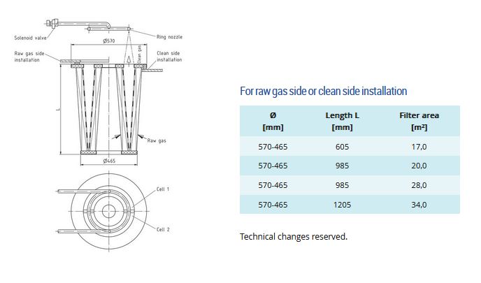 Large filter area on small space. Filter side inside and outside. Alternate cleaing by jet pulse during operation. Conical shape.