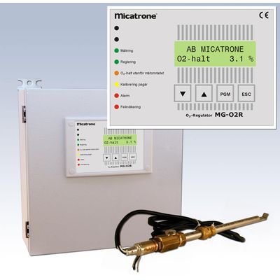 MG-O2R both measures and regulates the O2 content of flue gases. MG-O2R measures o2 content and temperature in the flue gases as well as the temperature of the combustion air. Using the O2 content, flue gas temperature and the temperature of the combustion air, the fuel efficiency is calculated.