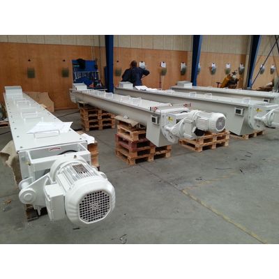 Screwconveyors Ø300mm. 4 psc. in industrial design. Features: Self carrying center tubes. Spherical roller bearings supported outside the screw house. Adjustable shaft sealing. Manufactured in carbon steel. Painted according to customer specifications.