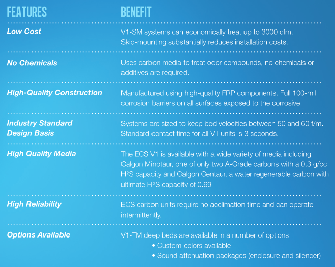 The V1- SM consists of an ECS standard V1 adsorber, fan, interconnecting ductwork mounted on an epoxy coated skid. All components come pre-wired and tested at the ECS facility.