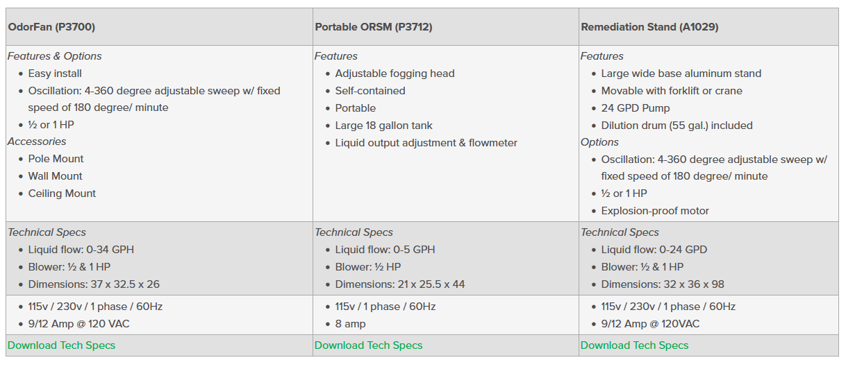For general odor control, Odor Fan systems help circulate an ultra-fine atomized mist of Ecosorb® onto odorous spaces. Ecosorb is mixed with water and pumped into the fan’s jet stream, blowing the mist over a wide area or pinpointed odor source.