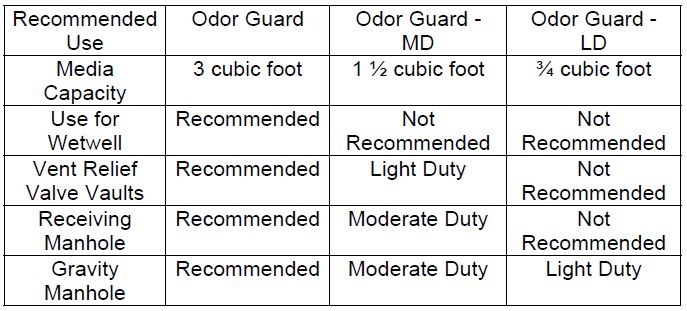 **High-capacity non-hazardous Odor Control Media is 99% natural and recycled materials to help protect our environment while giving you the performance you need. The system effortlessly breaths treated exhaust gas out and allows air in. The special media is a mix of solid organic and inorganic odor reactants and counteractants. Hydrogen sulfide and light mercaptans are safely and irreversibly reacted away while attacking other odors present. The media thrives on the wet humid environment encountered in manholes and is not adversely affected by occasional wetting. This unique high-capacity, lightweight and very low-pressure drop media was specially developed for sewer-type odor control.
