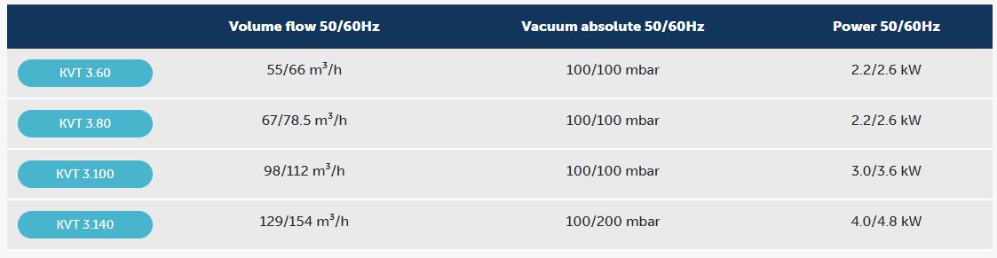 Becker KVT series vacuum pumps are medium vacuum, dry-running displacement pumps and are designed to operate on a continuous duty basis at any vacuum level to 100 mbar absolute. The KVT series oil-free rotary vane pumps utilise self-lubricating, graphite composite vanes, specifically engineered for Becker pumps. No oil to change and only minimal maintenance is required.