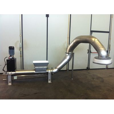 The screened material passes from the inlet hopper down to a pressing chamber. In this chamber, a friction cylinder removes the water content and compacts the material at a speed configured on the oil hydraulic control unit. The compacted material is then fed through a pressurized pipe to a container. The water removed from the material is collected and can then be treated. This machine offers many benefits, both financial (lower transport and disposal costs) and functional (moves better than traditional belts; no bad smells thanks to the sealed installation, and absolute hygiene because a polyethylene case can be fitted at the end of the outlet pipe for bagging all the compacted material).