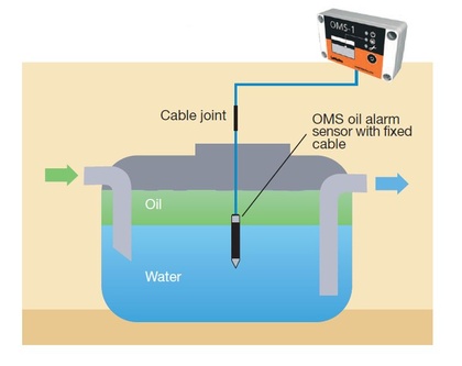 OMS-1 oil separator alarm device for monitoring oil layer in an oil separator. OMS-1 alarm device is speacially designed for oil separators. It indicates when it is time to empty the oil separator and thus prevents harmful hydrocarbon emissions to the sewer system.