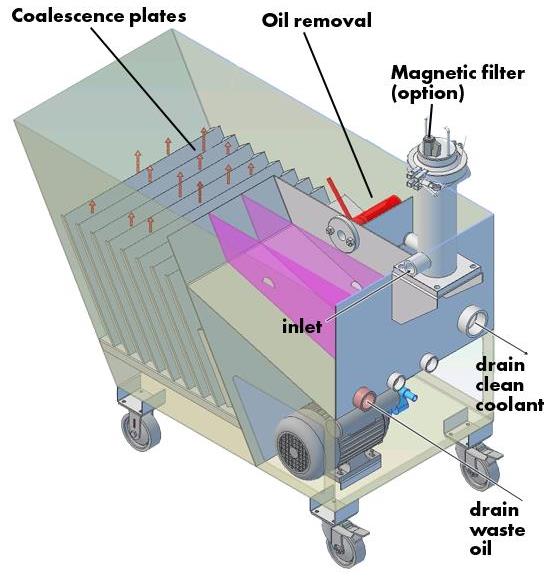 As a final result, tramp oil collects in a chamber, while the cleaned liquid flows back into the tank.