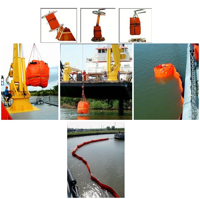 The "Rapid Pack" Storage System makes it possible to package the Auto Boom in 200 to 500 foot bundles, which can be rapidly deployed from boats, docks, platforms, or airlifted to spill sites. These "Rapid Packs" will float prior to inflation, due to the positive buoyancy feature of Oil Stop’s patented Auto Boom.