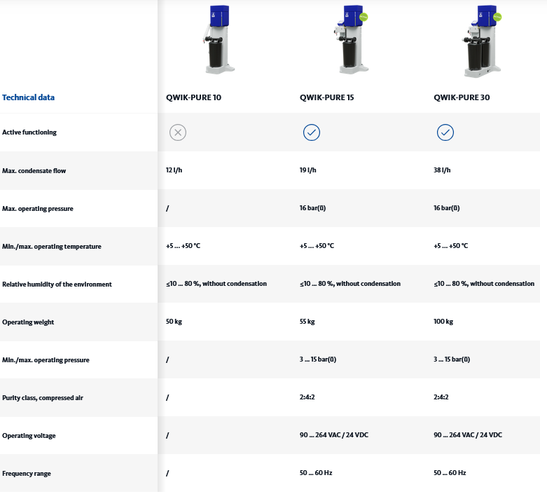 Conventional oil-water separators work according to the gravity principle and the condensate seeps through the filter medium. With the QWIK-PURE the condensate is actively forced through the pre-filter and main filter with light blasts of compressed air. During this process, the cartridge is permanently filled with liquid. This means that nothing can dry out and form impermeable boundary layers. On the other hand, there are hardly any unpleasant cultures with which the operators or service personnel can come into contact.