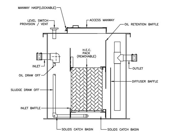 OWS TECH’s RF-Series oil water separators are design specific and meet or exceed today’s strict discharge limits. Our performance proven separators are made from the highest quality fiberglass to ensure structural integrity and use a unique high efficiency coalescer (HEC) pack to remove free non-emulsified hydrocarbons with a specific gravity less than 0.95. Our (HEC) packs unique random tube matrix flushes solids and removes oil droplets down to 20 micron size with an effluent discharge quality of 10 ppm or less. The RF-Series by design has a low maintenance factor and is easily serviceable due to its large manway access opening and light weight removable (HEC) packs. Flow rates range from 20-400 GPM thru a single unit and larger flow rates can be accommodated with multiple units. With an extensive line of standard products ranging from 4′ to 8′ in diameter we’re sure to have one that meets your specific application.