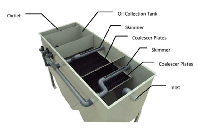 Dual Reverse Lamella Clarifier OWS provides superior separation of free and non water soluble oils using two angled packs of poly coalescer plates and reversing the flow through one pack to assist in flushing the solids from the pack. The on board oil collection systems allows for collection and further separation of oils. Two passive skimmers collect free floating oils and direct it to the on board oil collection system. Two large cone shaped solids collection areas provide ample volume for solids settling. Unit is constructed of stainless steel. Powder and ceramic coated.
