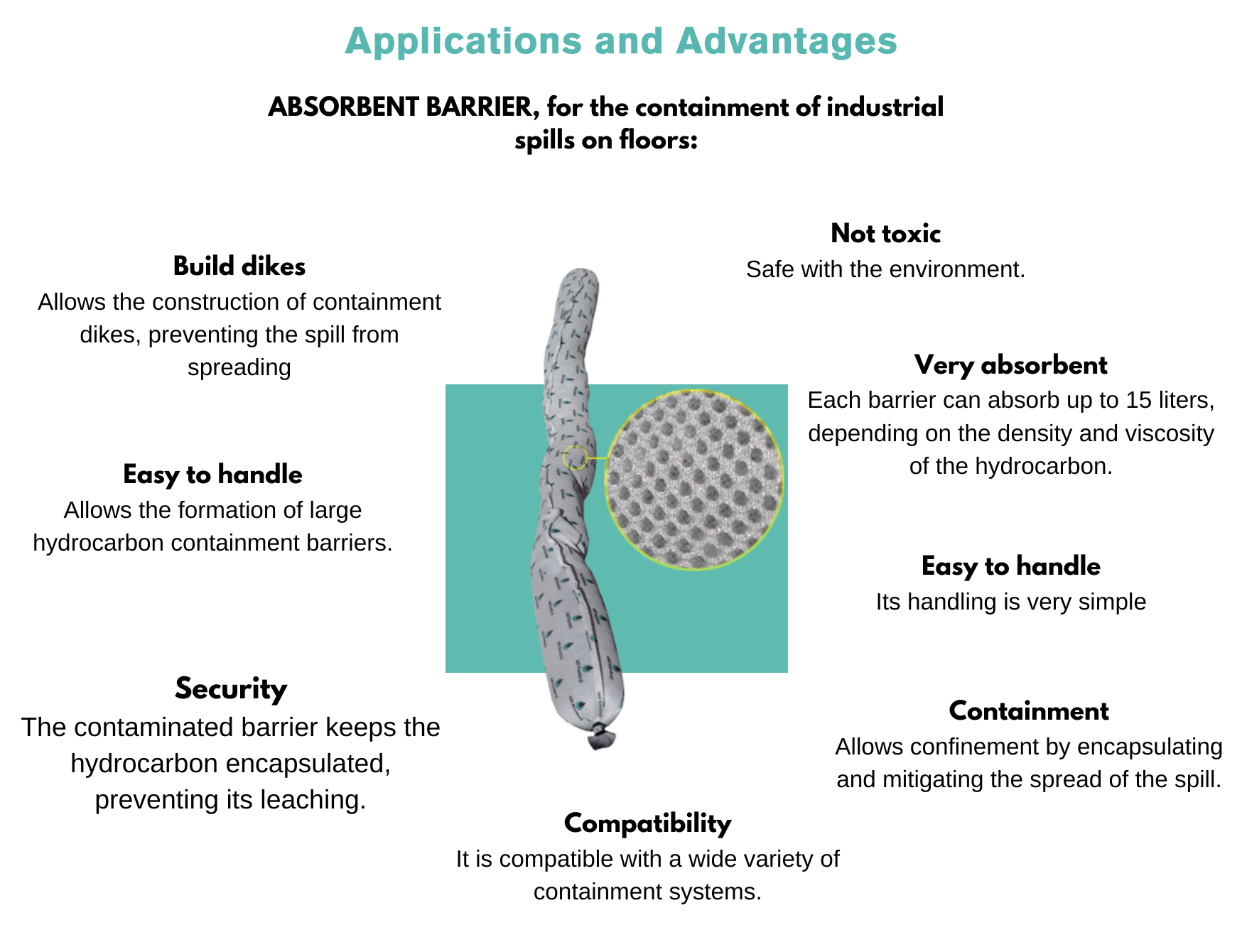 Sleeve made with 3d polyester fabrics, filled with bio-absorbent fiber for the containment of spills or industrial discharges on floors, since they allow the creation of containment dikes preventing the spill from spreading. They allow them to be linked to each other by varying their containment size. Once this containment barrier is installed, it is recommended to add bulk fiber, which will be in charge of absorbing the contained spill; once absorbed, the floor is swept and the already used absorbent barrier is removed. They are recommended in oil spills or accidents on highways or routes, preventing the spread of the spill.